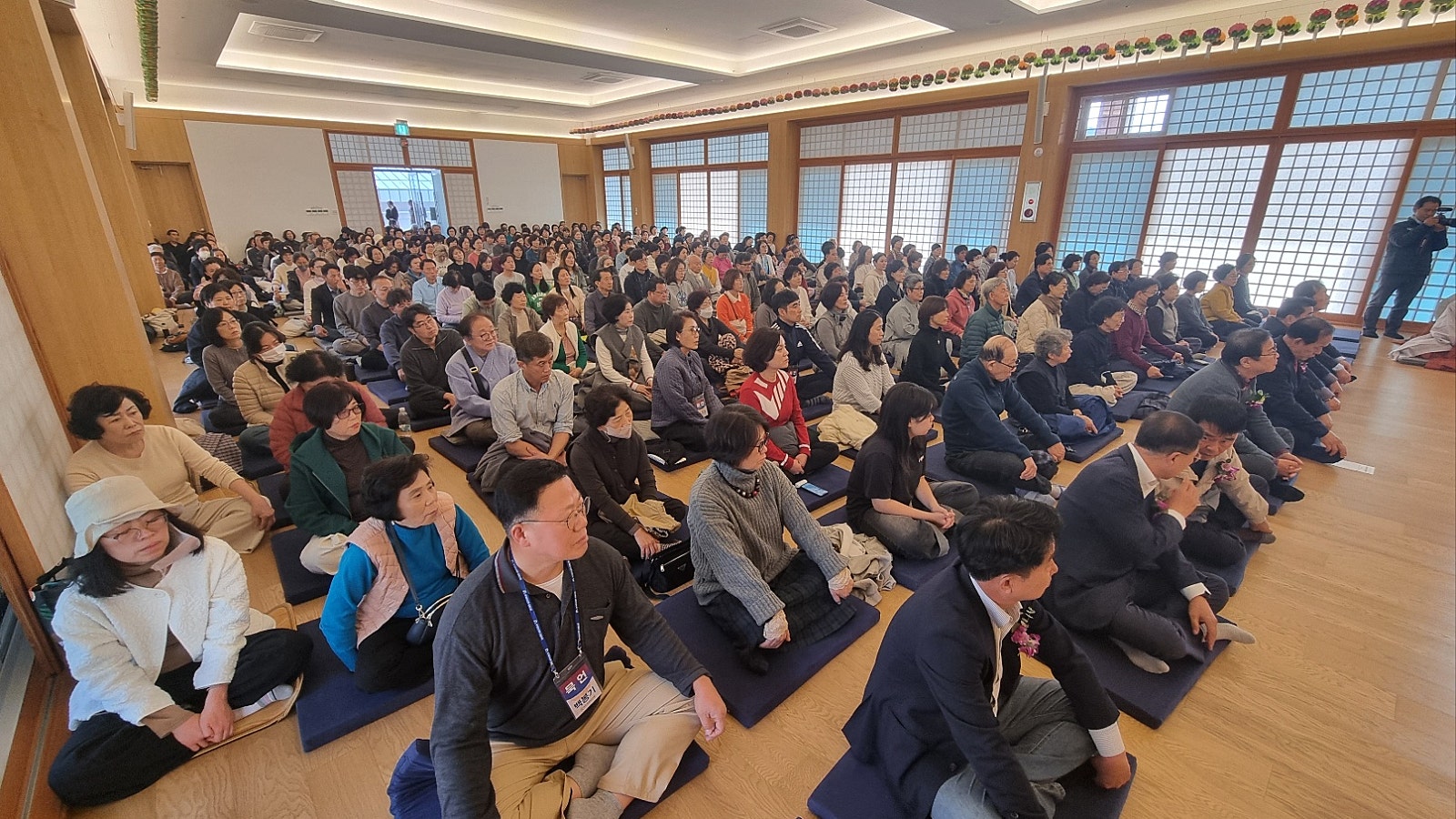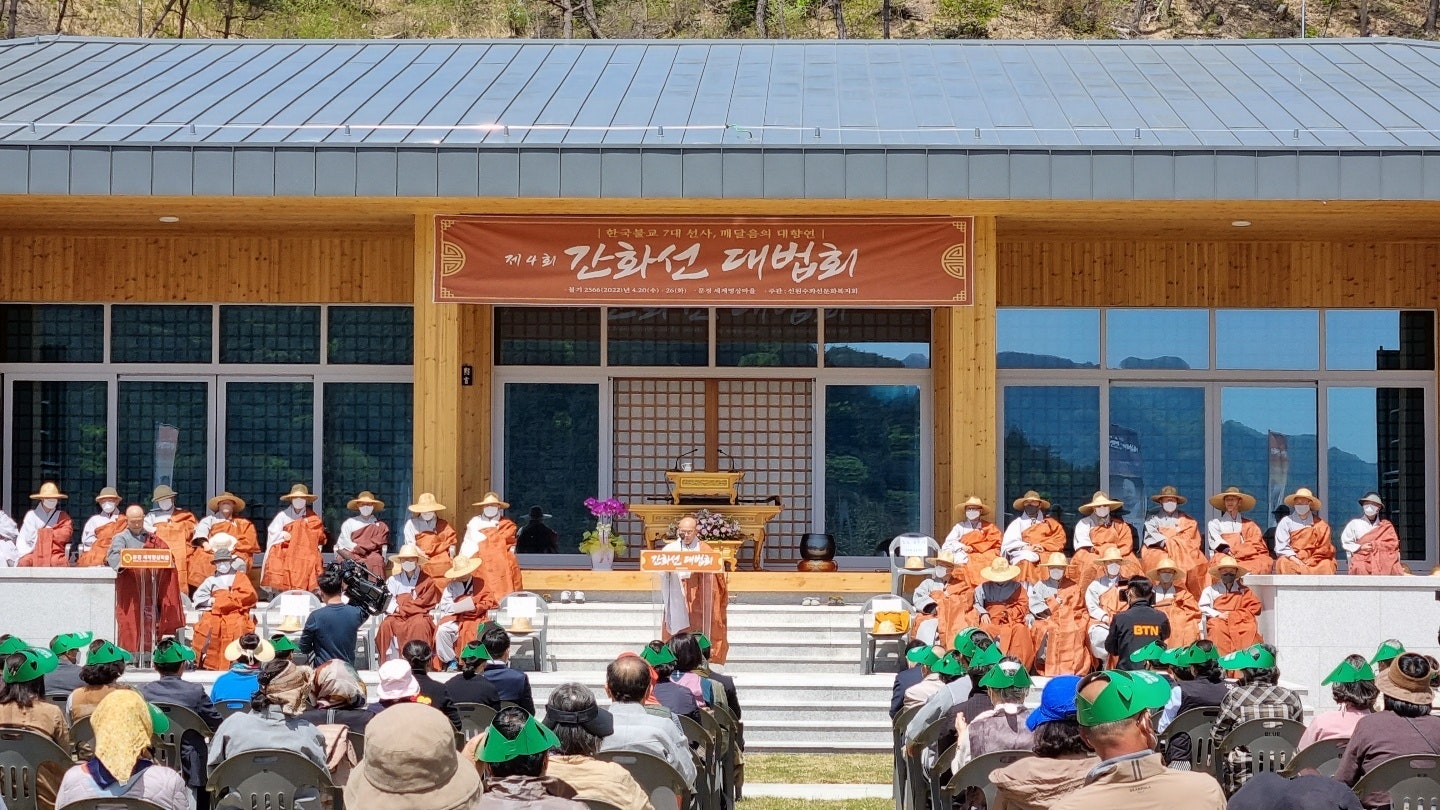 ▲2022년 4월 13일 문경세계명상마을 개산 기념 간화선대법회. 이날 대한불교조계종 종정 성파 대종사와 원로의장 대원 대선사, 총무원장 원행 스님, 수좌회 원로 현관ㆍ무여ㆍ혜국ㆍ일오ㆍ의정 대종사 등 한국불교를 대표하는 선승들과 박진 외교부장관, 박형준 부산시장, 이철우 경북도지사, 주호영ㆍ김태호ㆍ윤상현ㆍ이원욱 국회의원, 고윤환 문경시장, 정순균 강남구청장, 함승희 전 국회의원(강원랜드 사장 역임) 등 사회 저명인사들이 세계명상마을의 개산을 축하했다.