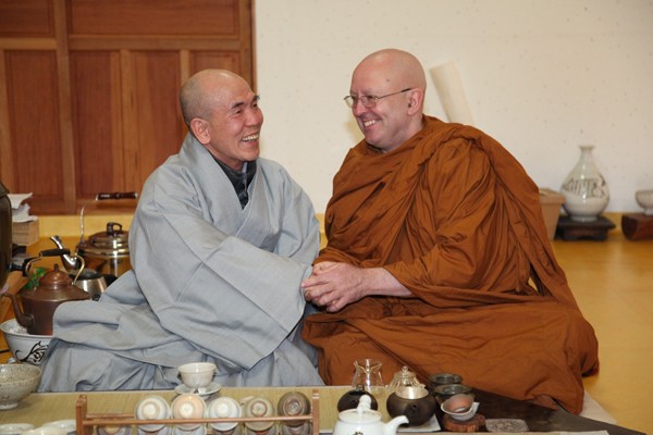 ▲한국불교 수행을 대표하는 간화선과 초기불교의 거장이 처음으로 만난 곳. 적명스님과 아잔 브람은 차담을 나누며 반갑게 손을 잡고 환하게 웃고 있다. 방한 중인 세계적인 명상수행가 아잔브람 스님과 조계종립 봉암사 태고선원 조실 적명스님이 2013년 1월16일 봉암사 선열당(禪悅堂)에서 ‘초기불교와 간화선의 만남’이란 주제로 장시간 대화를 나누었다 / 출처 : 불교신문