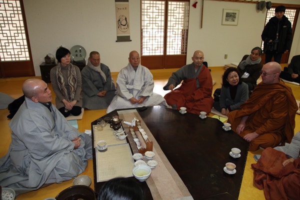 ▲간화선과 초기불교의 만남에 앞서 봉암사에 도착한 아잔 브람과 수좌 적명스님(왼쪽끝), 주지 원타스님(왼쪽에서 네번째)이 반갑게 맞이하고 차담을 나눴다. 왼쪽에서 다섯번째는 세계명상힐링캠프 준비위원장인 각산스님. (전현수 박사 오른쪽에서 뒷쪽) / 출저 : 불교신문