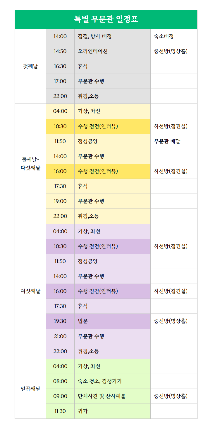 수행 기간 동안 외부와의 모든 교류가 차단되며, 묵언(黙言)을 유지합니다.